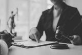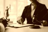 .Asian female lawyer holding hammer working in office of justice Use your finger to point at a contract document to draw correct conclusions, laws, guidelines and justice concepts.