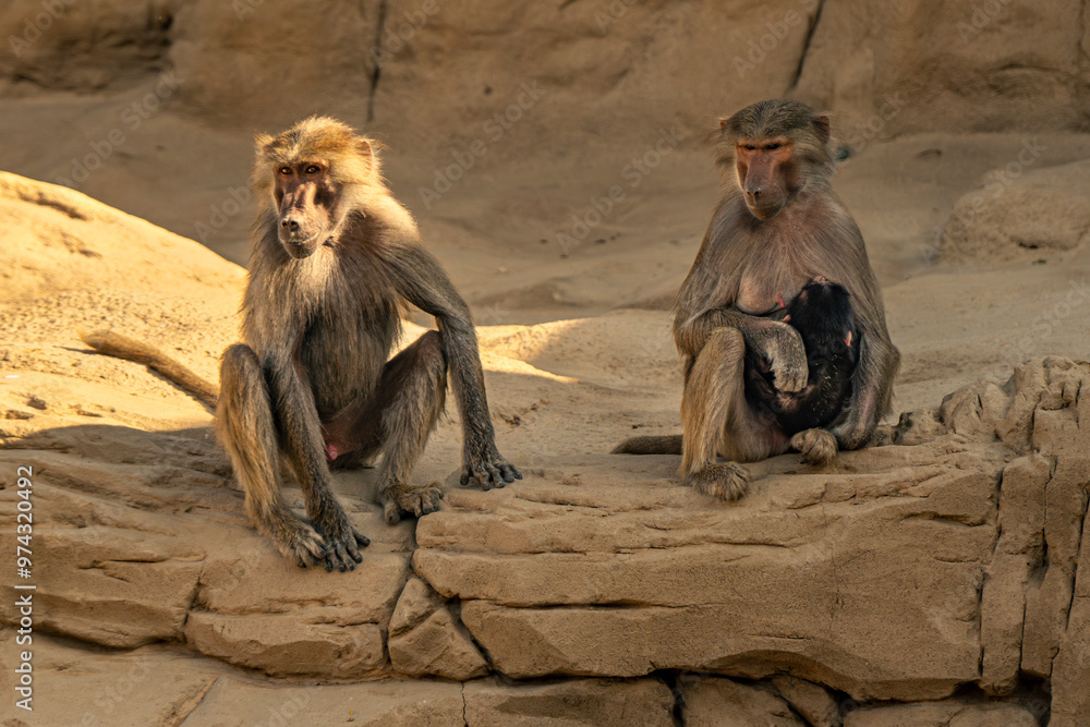 Baboon family of male, female, and son in her lap breastfeeding. sitting on rock ledge.