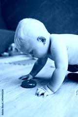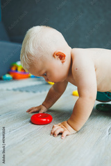 A little boy in shorts sits on the carpet at home and plays with educational toys. A child builds a plastic pyramid.