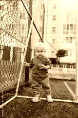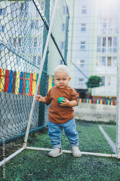 A little boy in jeans and a T-shirt is playing on the street. Denim clothes for boys. A child on the sports field. Child development.