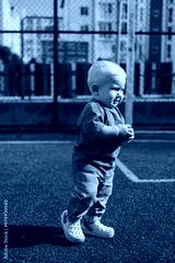 A little boy in jeans and a T-shirt is playing on the street. Denim clothes for boys. A child on the sports field. Child development.