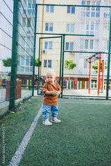 A 1-year-old boy in stylish jeans and a T-shirt is playing on the street. A child plays outdoors on a playground. A child on the football field.