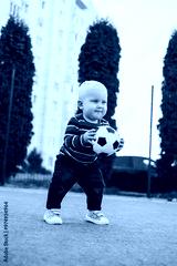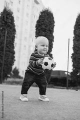 A 1-year-old boy plays with a soccer ball on the street. The child is playing in the fresh air. Stylish little blond boy.