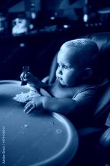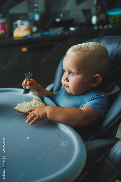 A 1-year-old boy sits in a high chair and eats bread. The baby eats bread. Self-feeding of the child.