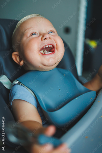 A 1-year-old boy sits in a high chair and eats bread. The baby eats bread. Self-feeding of the child.
