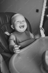 A 1-year-old boy sits in a high chair and eats bread. The baby eats bread. Self-feeding of the child.