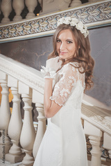 beautiful elegant girl in a white dress standing on vintage stairs in the castle