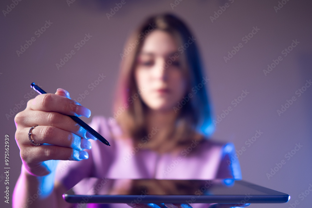 Business woman with tablet. Businesswoman manages company through gadget. Blurred lady holding tablet computer. E-tablet for business people. Business technology concept. Electronic tablet