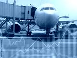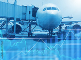 Airplane with airport. Air travel growth chart. Air passenger transportation industry. Airplane with telescopic gangway. Airliner at modern airport. Airline ticket price growth chart