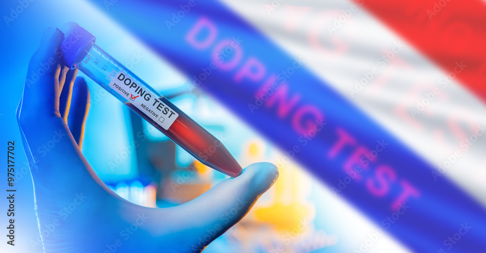 Doping test in France. Test tube with blood. Flag of France. Blood sample test for doping. Positive test for prohibited substances. Analysis blood of athletes for doping. Search for illegal drugs