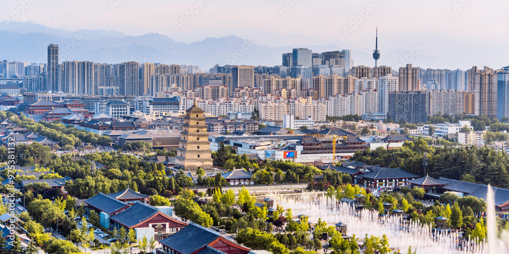 High perspective urban skyline scenery of the Big Wild Goose Pagoda in Xi'an, Shaanxi, China