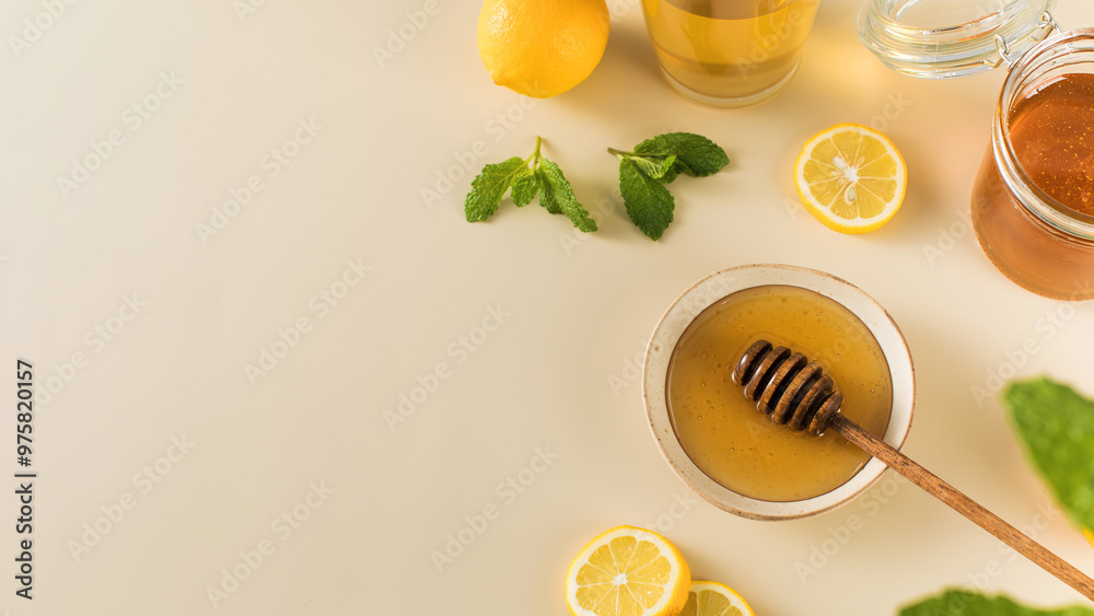 Honey with fresh lemons and fresh mint leaves on beige. Copy space