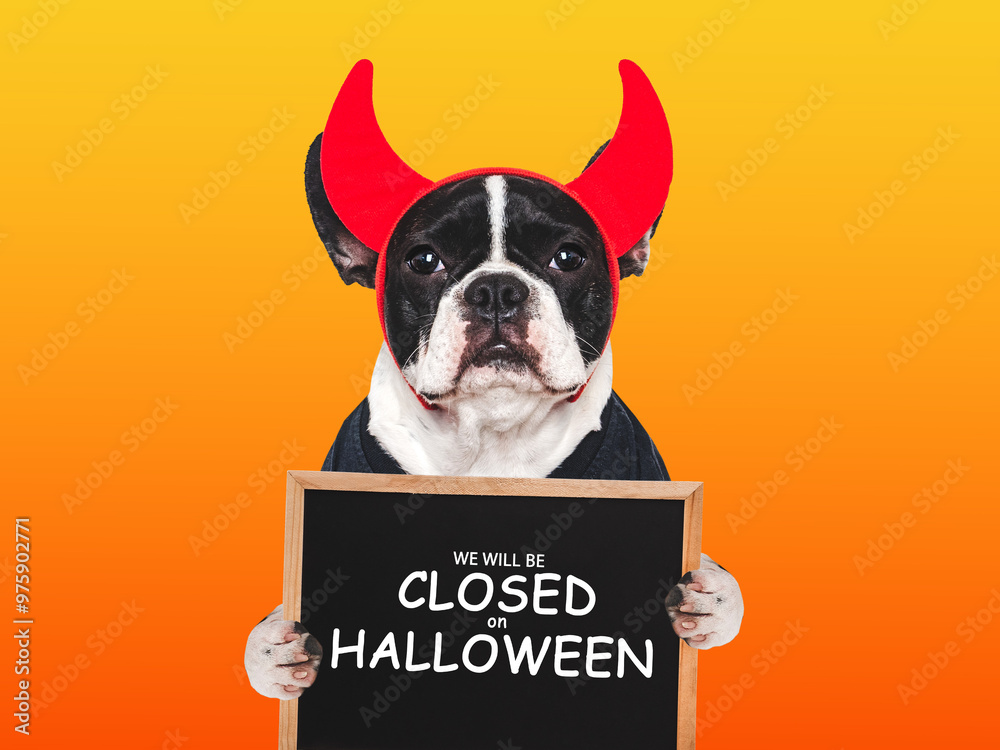 Signboard with the inscription We will be closed on Halloween. Charming puppy and Halloween costume. Closeup, indoors. Studio shot. Pets care concept