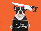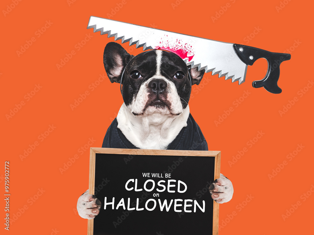 Signboard with the inscription We will be closed on Halloween. Charming puppy and Halloween costume. Closeup, indoors. Studio shot. Pets care concept