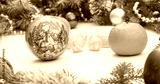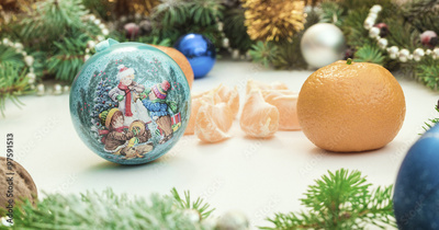Christmas frame with Christmas ornaments and decorations.tangerines, cloves