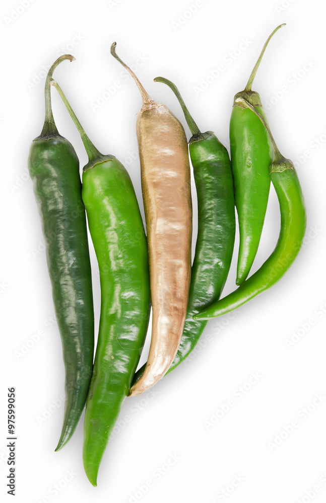 Concept od difference and success.Golden pepper outstands green.