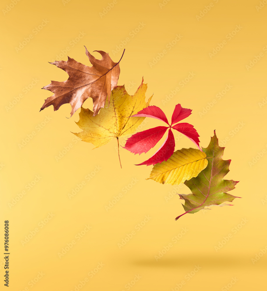 Beautiful bright colorful autumn leaves falling in the air isolated on yellow background. Zero gravity or levitation autumn conception. High resolution image.