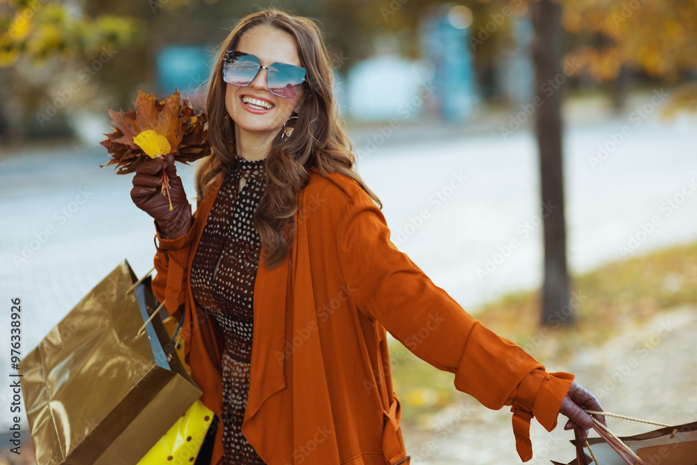 smiling elegant woman in brown trench coat with shopping bags