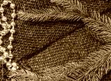 New design. Christmas design. On the sacking on the table green branch of fir or pine. Beads. Empty space for advertising and printing.