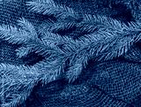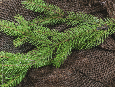 New design. Christmas design. On the sacking on the table green branch of fir or pine. Beads. Empty space for advertising and printing.
