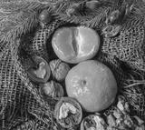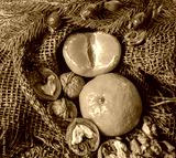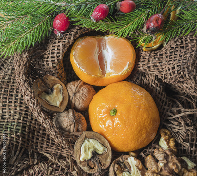 on a table covered with burlap are candles are tangerines, cones, fir or pine twig and berries. Christmas design