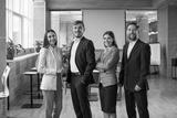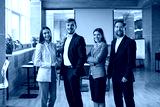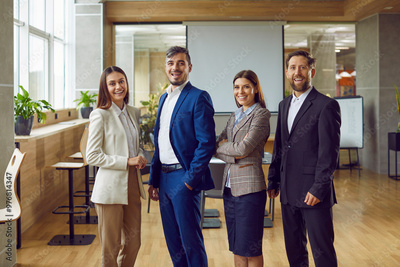 Portrait of a happy young business people men and women looking at camera and smiling indoors. Company employees or group of staff standing in office in suits confidently and cheerfully.