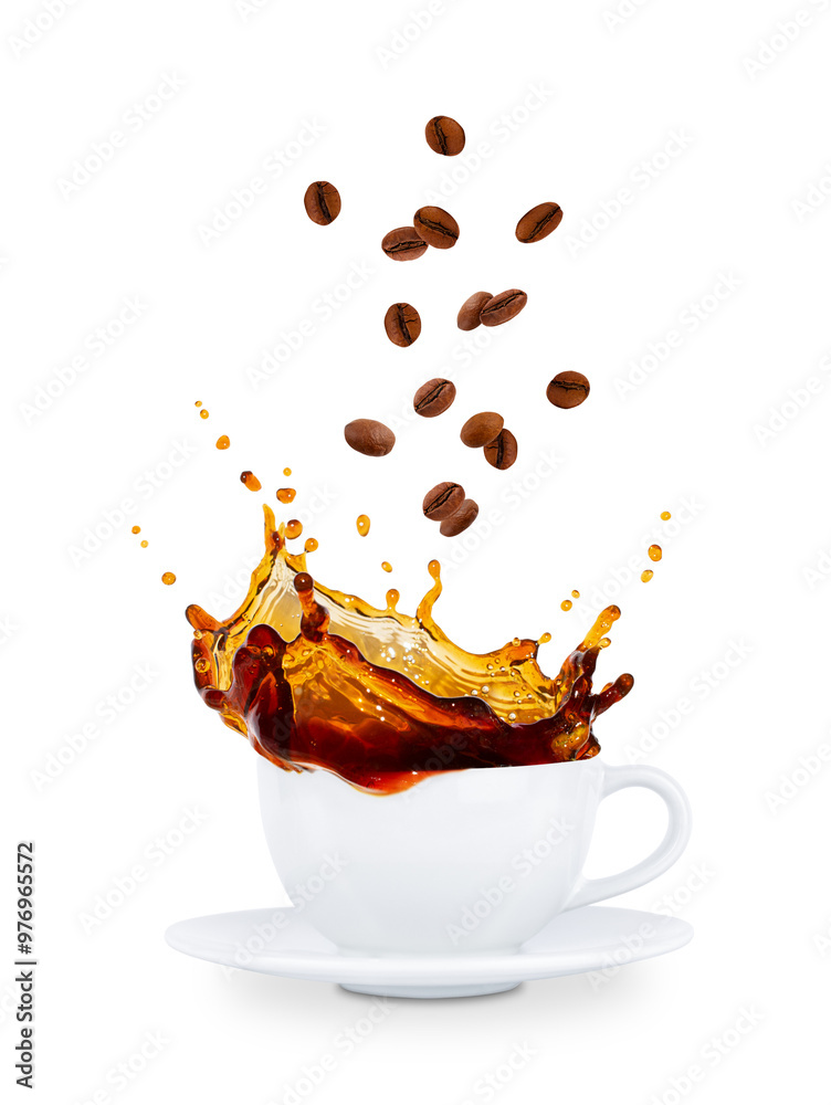 Coffee splash in white with floating coffee beans. Isolated on a transparent background. Stock photo.