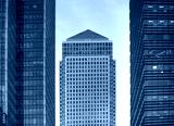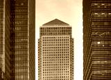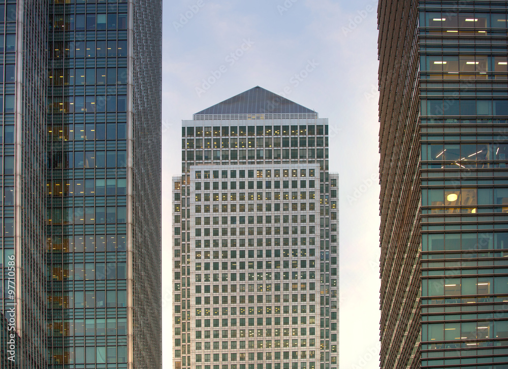 LONDON, UK - SEPTEMBER 9, 2015: Canary Wharf office buildings at sunset