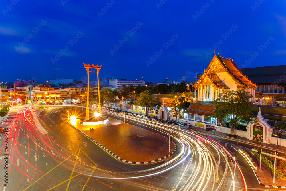 The Giant Swing with Temple of Buddha at dusk (Bangkok, Thailand)