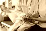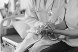 Doctor in white coat with stethoscope holding patient's hand in hospital room, offering comfort and compassion