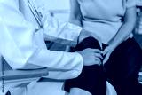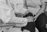 Healthcare professional tends to a businesswoman's injured knee in an office setting, offering care and compassion during the appointment