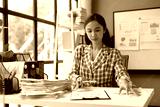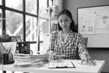 Young professional analyzes financial data at her desk, with paperwork and a whiteboard showing business metrics