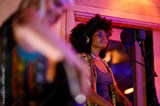 Portrait of latino female singing song on microphone in a music studio