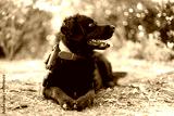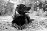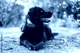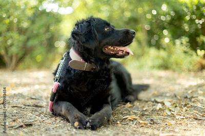 Black dog with a pink leash lying down, panting and looking to the side in a natural setting.
