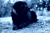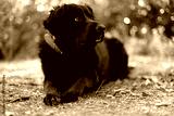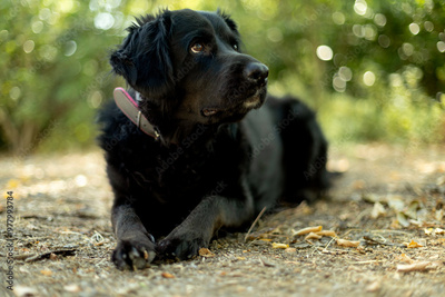 Black dog lying on the ground, looking up with a curious expression in a natural setting.