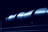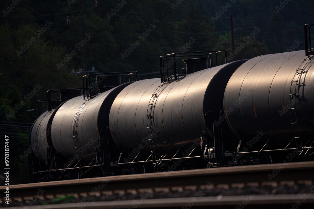 Black tank cars cisterns for gas and oil, captured in Portland, Oregon industrial area. High quality close up picture for download.
