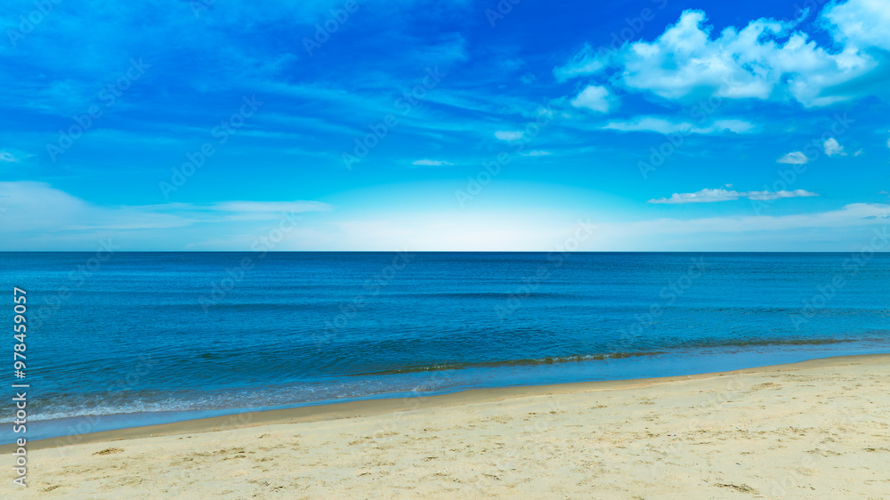 Nature of the beach and sea Summer with sunshine, sandy beaches, clear blue waters sparkling against the blue sky. On an island with good ecology and environment Background for summer vacation concept
