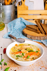 Lohikeitto, salmon fish soup with cream, potato, carrots, leek and dill in bowl