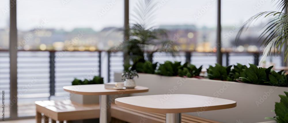 A wooden tabletop in a contemporary restaurant feature indoor garden and a stunning city view.