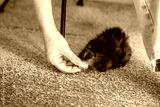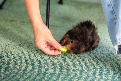 A woman hand feeds a black fluffy guinea pig