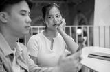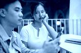 An unhappy Asian woman is feeling jealous, looking at her boyfriend while he is texting on his phone