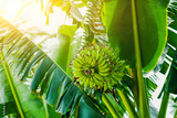 Green bananas hang in clusters on banana plantations. Industrial scale banana cultivation for worldwide export.