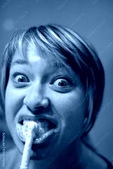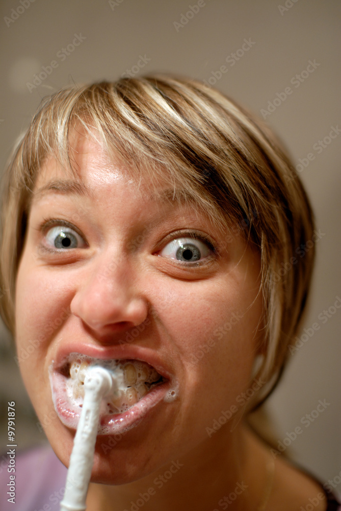 Woman brushing her teeth and grimacing