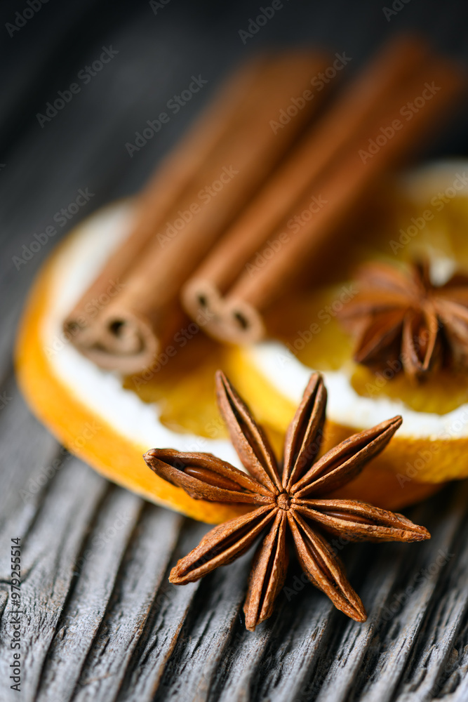 Creative Christmas aromatic concept with cinnamon sticks, candied orange slices, anise stars close up. Food photography