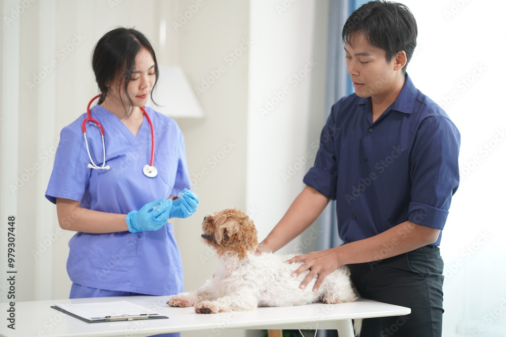 Annual health check-up and vaccination for dogs at the animal hospital and vaccination against rabies to prevent infection. Taking dogs for annual health check-up with a veterinarian.