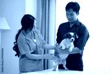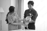 Annual health check-up and vaccination for dogs at the animal hospital and vaccination against rabies to prevent infection. Taking dogs for annual health check-up with a veterinarian.
