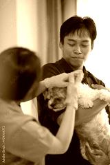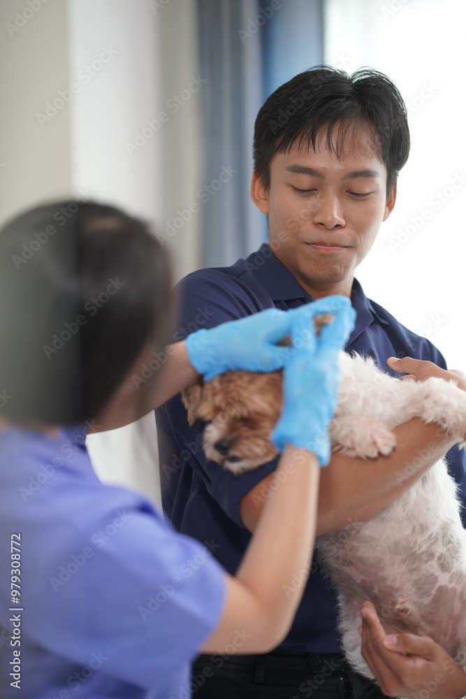 Annual health check-up and vaccination for dogs at the animal hospital and vaccination against rabies to prevent infection. Taking dogs for annual health check-up with a veterinarian.