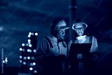 Engineer wear uniform and helmet stand workplace hand holding tablet and laptop computer, survey inspection team work plant site to work with night lights oil refinery background.