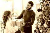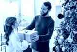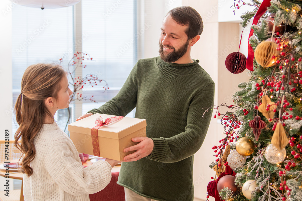 Happy father and daughter cheerfully exchange gifts near the Christmas tree.