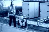 Asian man engineer holding tablet working at rooftop building construction. Male technician worker working checking hvac of office building. Engineering installing large air conditioning system.